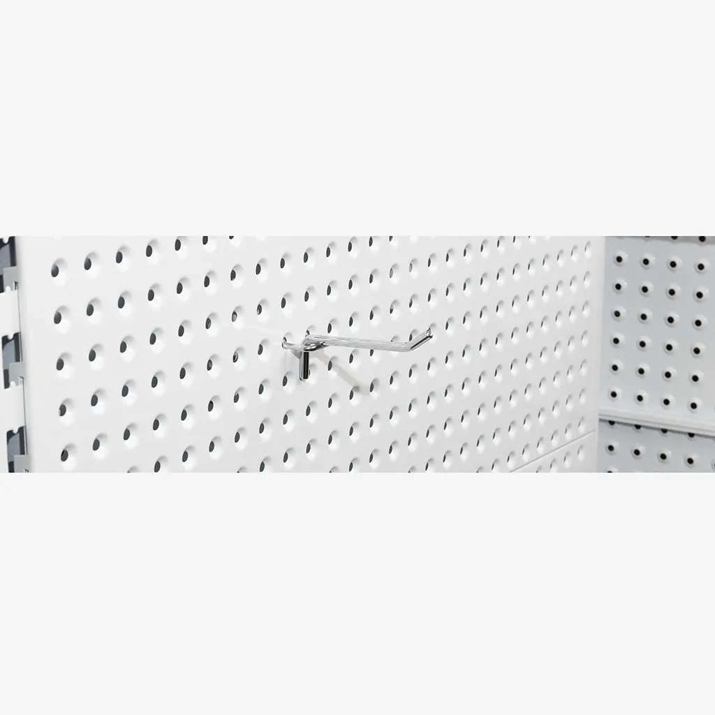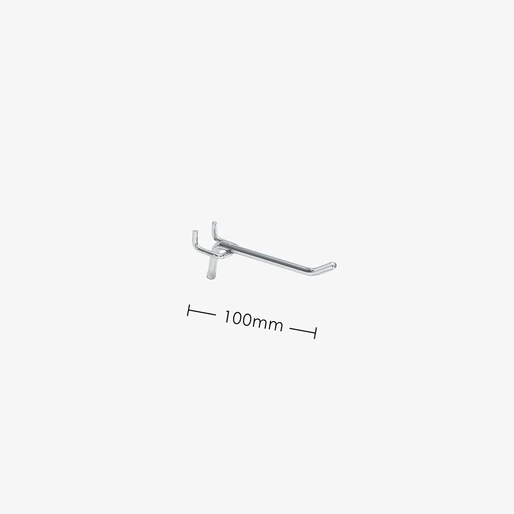 100mm chrome pegboard hooks, at 6mm diameter these hooks are strong and are specially made for Volcano pegboard gondola shelving. With these hooks, you can rest knowing they will take the weight of your products.