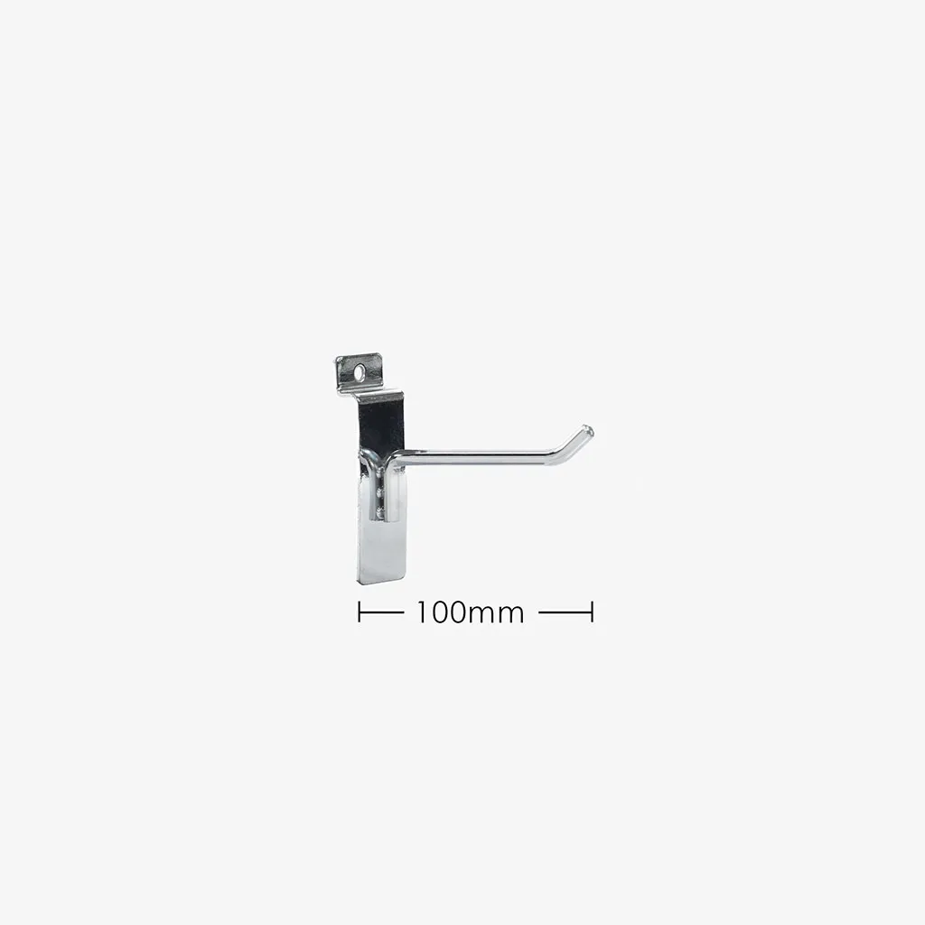 100mm heavy duty chrome dipped slat wall hook, suitable for all major slatwalls, 6mm diameter with three spotwelds for support this hook will not let you down. Stylish and strong you will be proud to display your products on these slatwall hooks.
