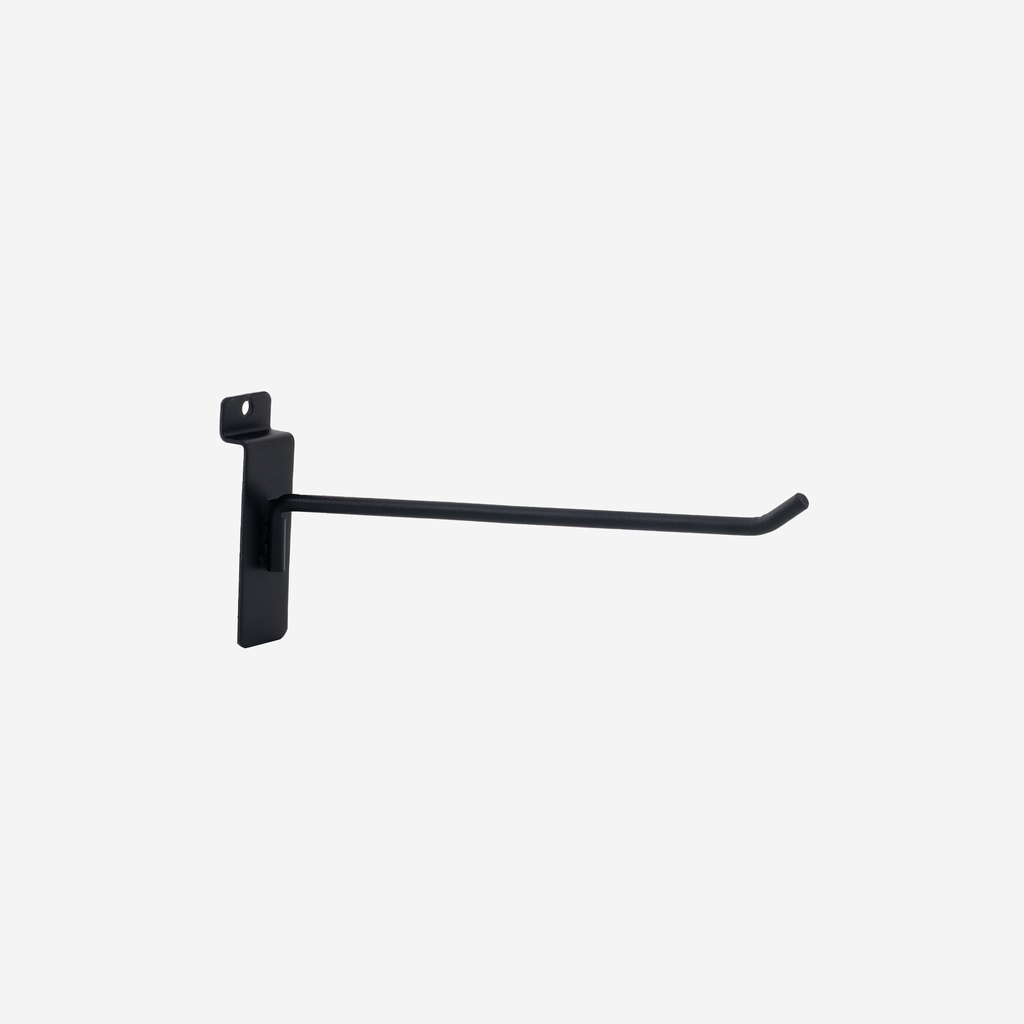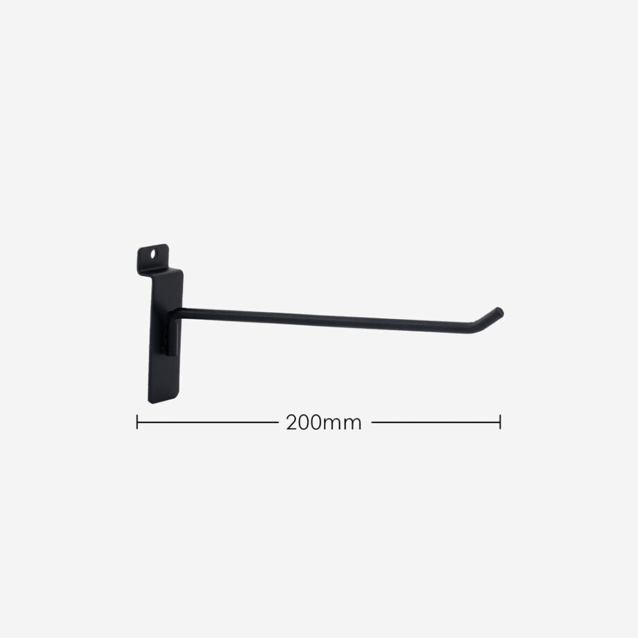 200mm heavy duty black slat wall hook, suitable for all major slatwalls, 6mm diameter with three spotwelds for support this hook will not let you down. Stylish and strong you will be proud to diplay your products on these slatwall hooks.