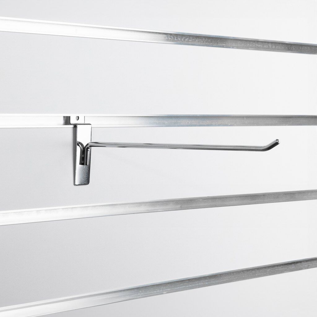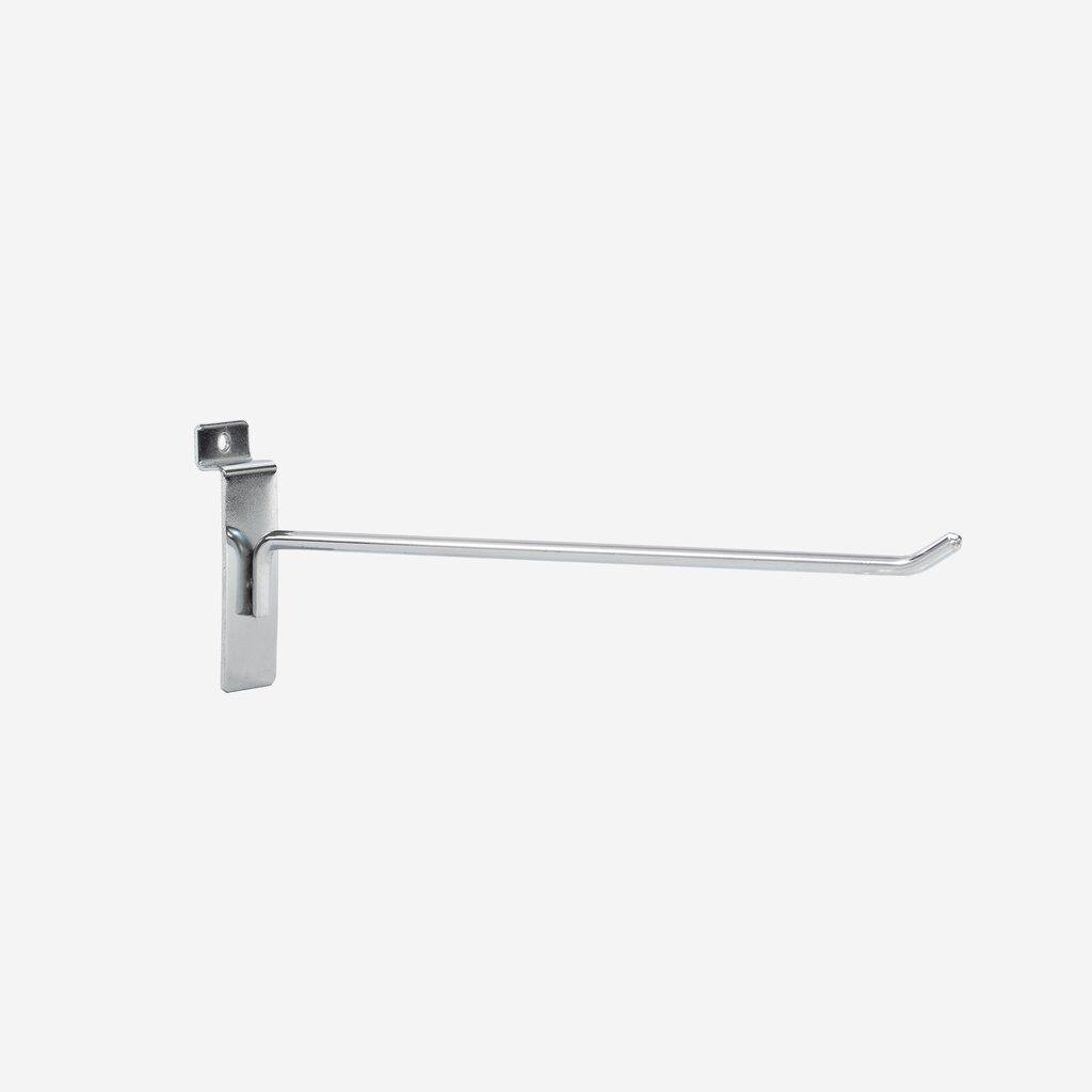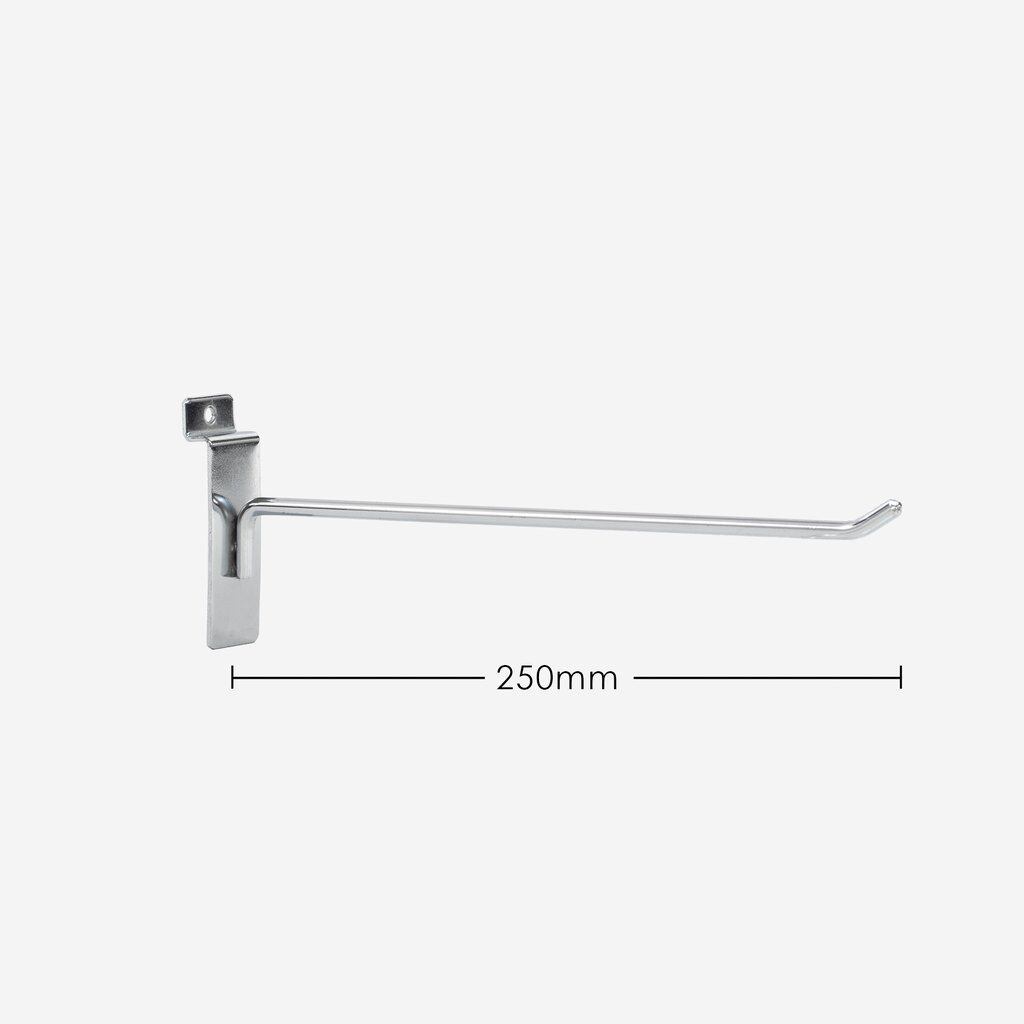 250mm heavy duty chrome dipped slat wall hook, suitable for all major slatwalls, 6mm diameter with three spotwelds for support this hook will not let you down. Stylish and strong you will be proud to diplay your products on these slatwall hooks.