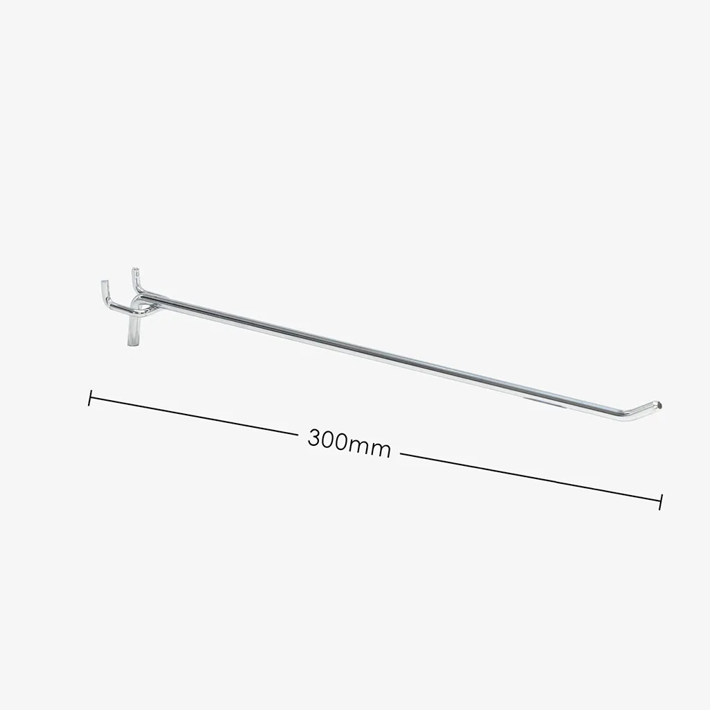300mm chrome pegboard hooks, at 6mm diameter these hooks are strong and are specially made for Volcano pegboard gondola shelving. With these hooks, you can rest knowing they will take the weight of your products.