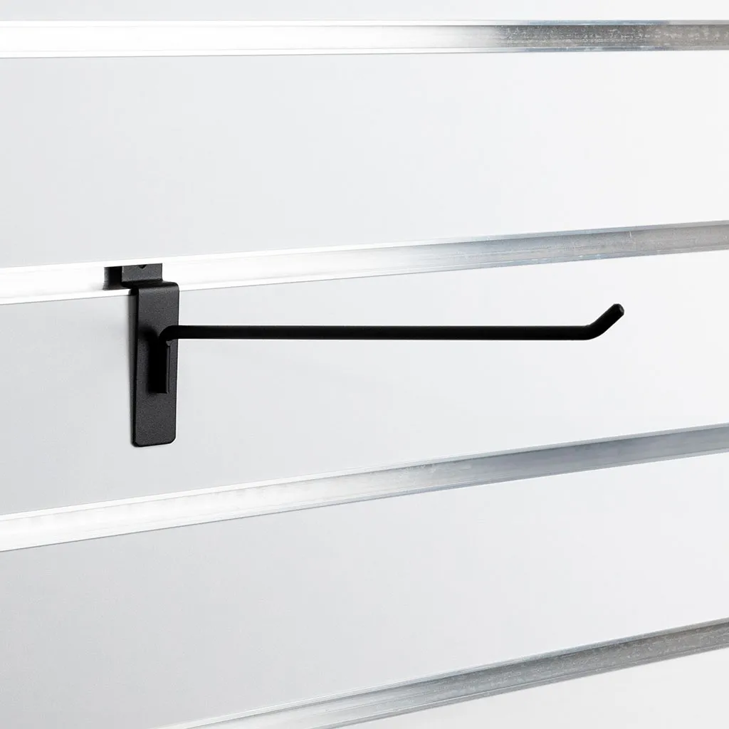 300mm heavy duty black slat wall hook, suitable for all major slatwalls, 6mm diameter with three spotwelds for support this hook will not let you down. Stylish and strong you will be proud to diplay your products on these slatwall hooks.