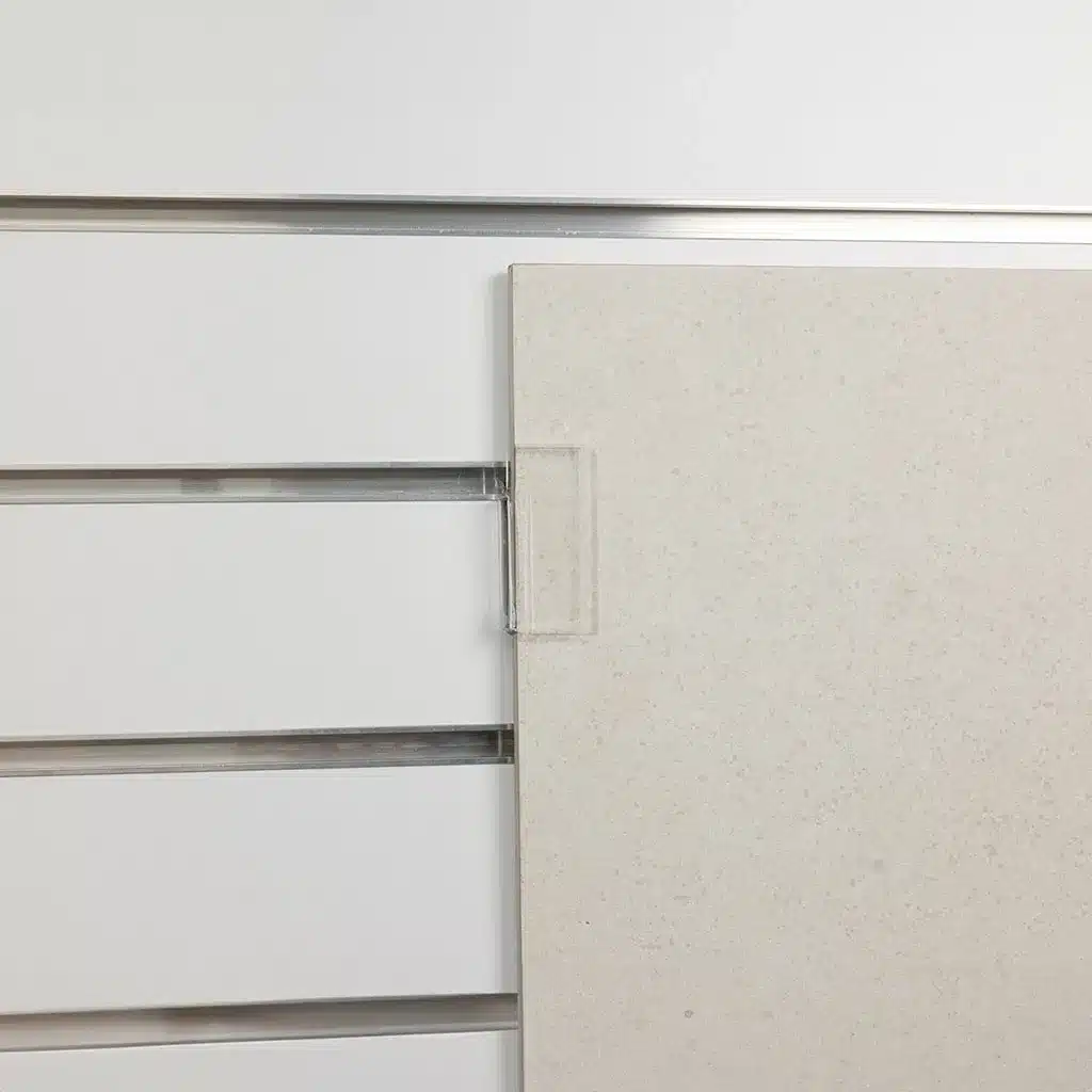 A sleek, transparent acrylic holder designed to securely display tiles on slatwall panels while keeping the focus on your product. Its minimal design offers strong side support without distracting from the display.
