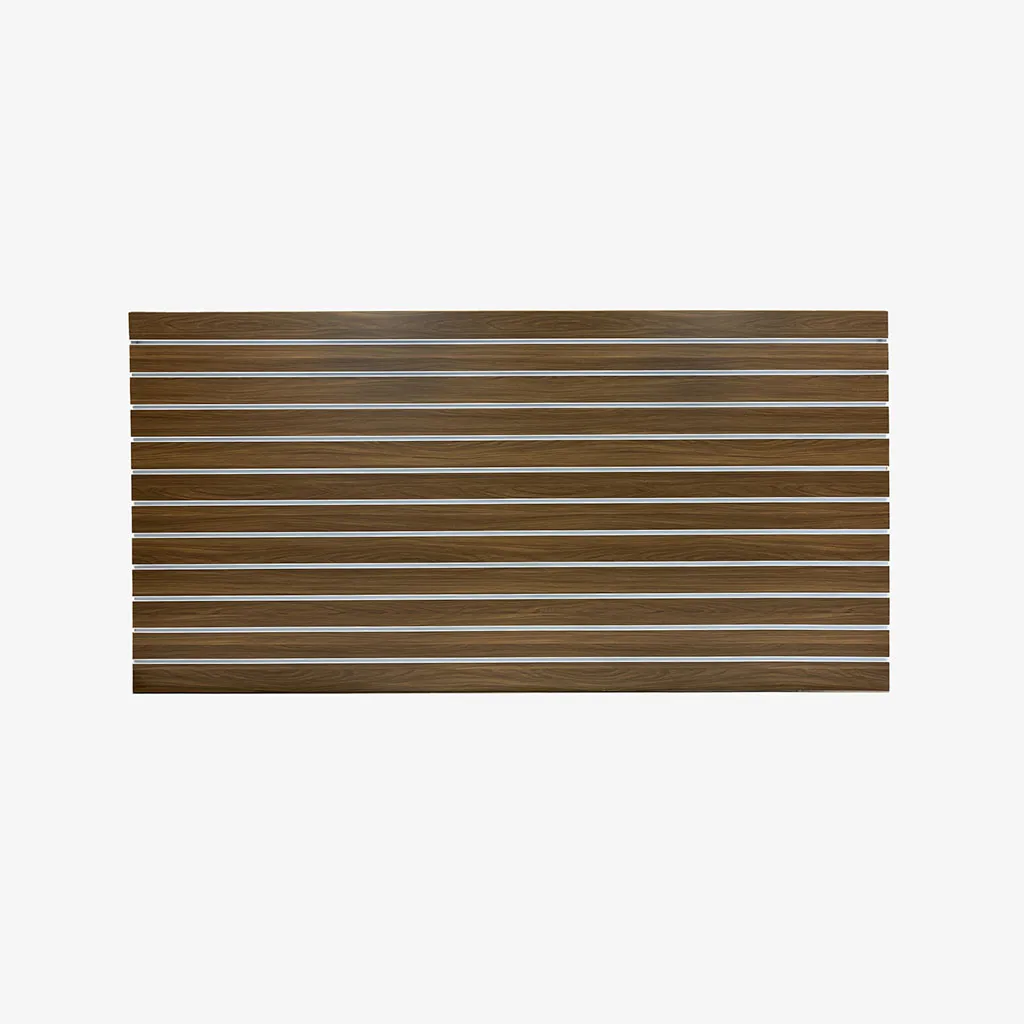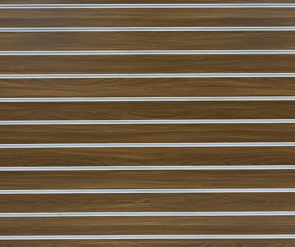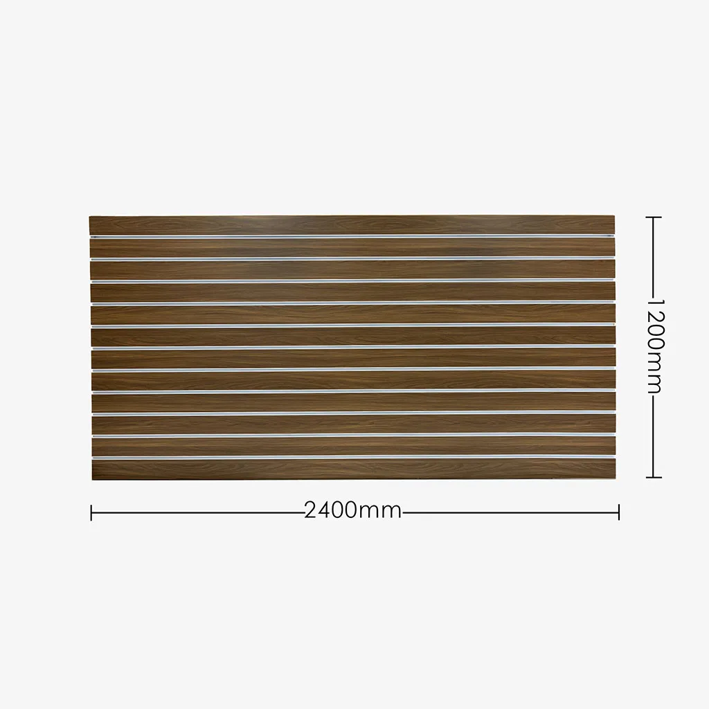 Dark walnut matte landscape horizontal slatwall with white aluminium inserts, 100mm spaced grooves, and 1 half groove, 2400 L x 1200mm H.