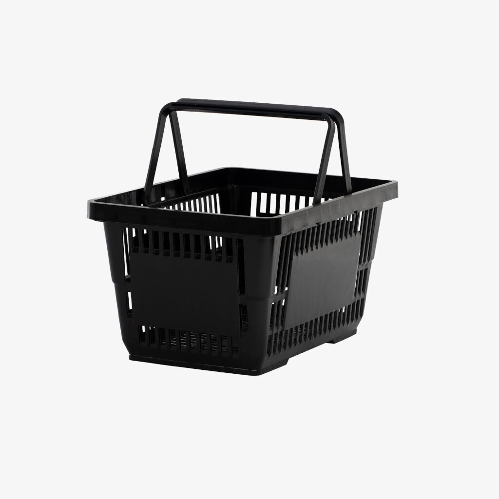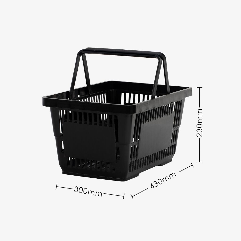 Black shopping basket with two black handles, 22L capacity, up to 30kg. Stackable and Lightweight basket great for use in any supermarket, pharmacy or variety shop.
