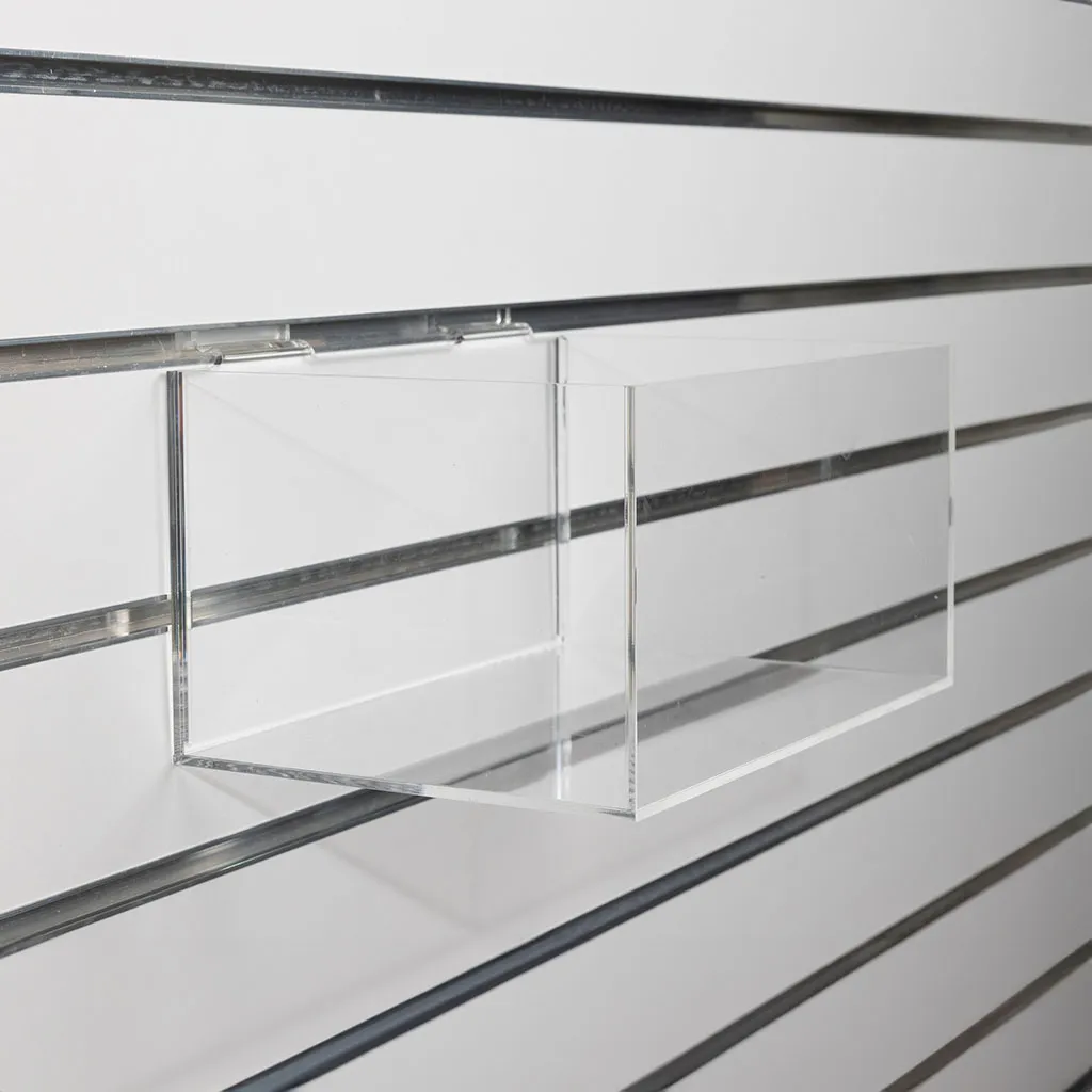 The Slatwall acrylic display box has many uses and functions. Use the slatwall display bin to store a multitude of items in your retail store or back room.