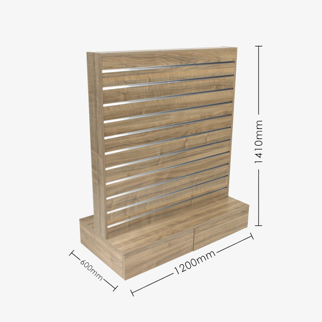 Upgrade your retail environment with our sophisticated and versatile Double-Sided Center Bay Walnut Slatwall Gondola, now featuring convenient drawers for enhanced storage solutions. This freestanding unit perfectly matches various retail settings, including luxury boutiques, functional hardware outlets, convenience stores, contemporary pharmacies, fashion retailers, and boutique grocery markets. Its elegant walnut finish ensures your products are showcased with warmth and sophistication, capturing your customers’ attention.