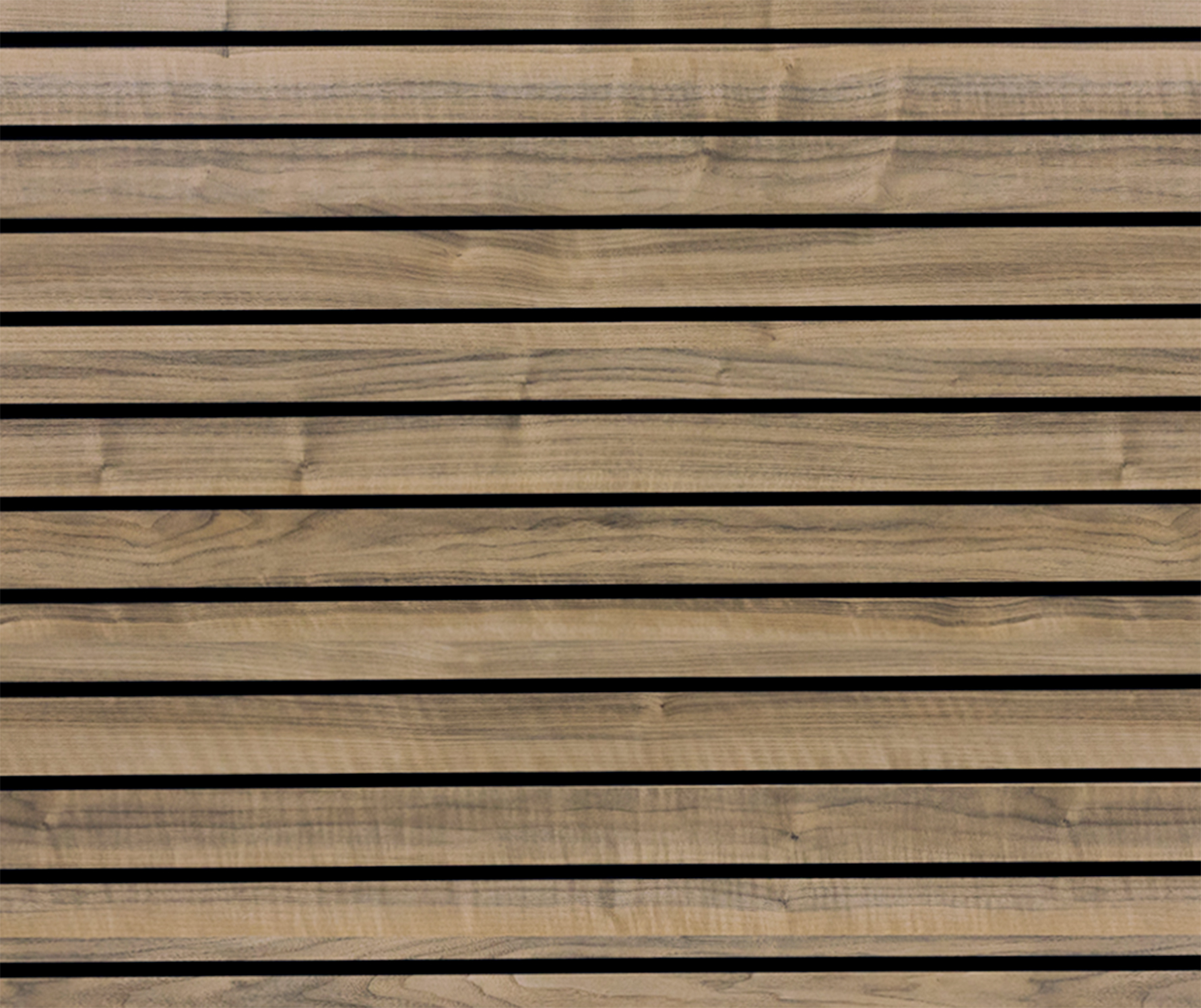 Walnut Landscape Horizontal slatwall with 100mm spaced grooves and 1 half groove with black inserts.