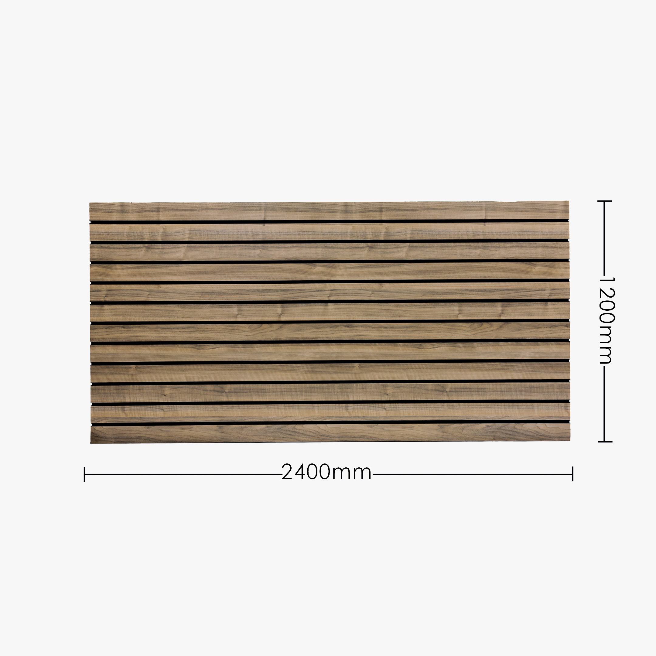 Walnut Landscape/Horizontal slatwall with 100mm spaced grooves and 1 half groove, 2400mm wide x 1200mm high with black extrusions Code: WAL100B