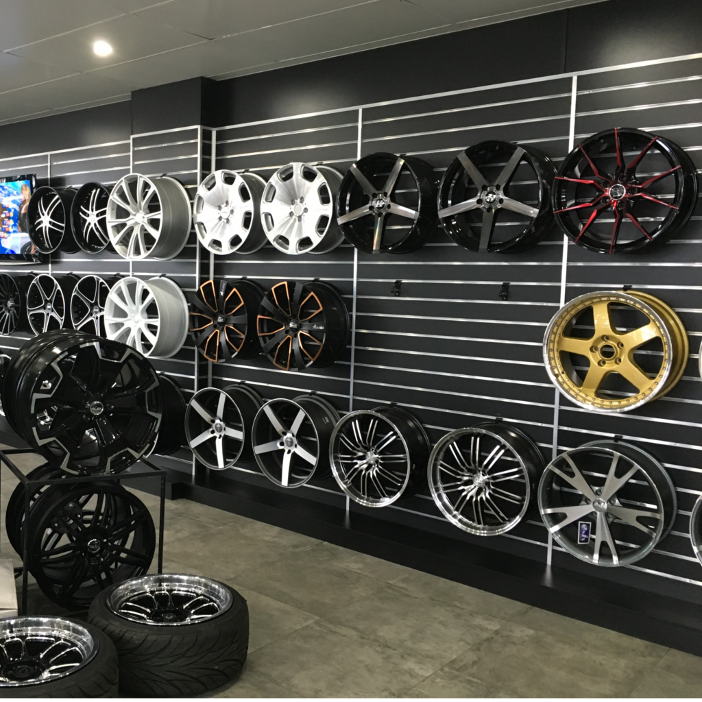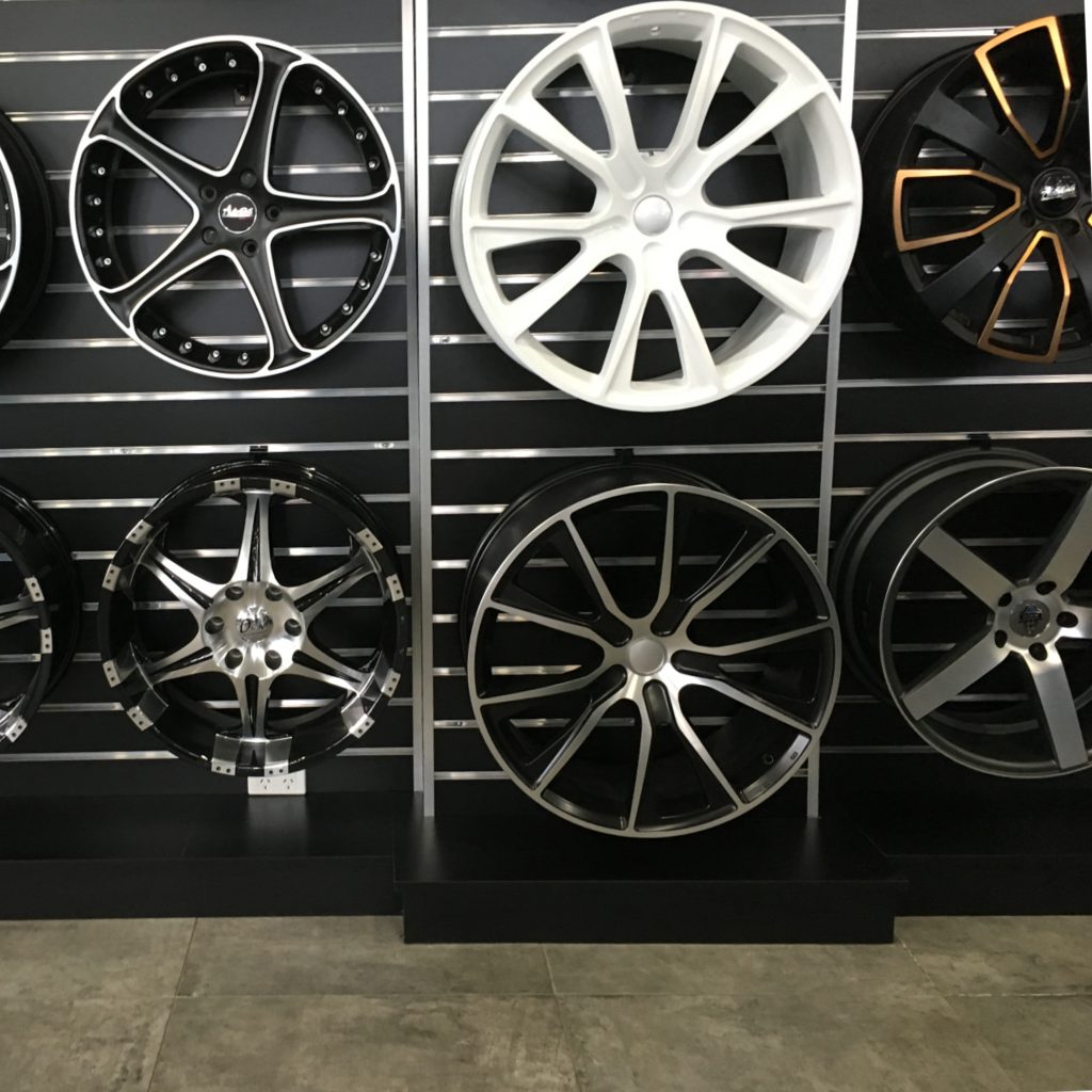 A great solution to display wheels/rims on slatwalls