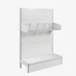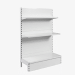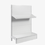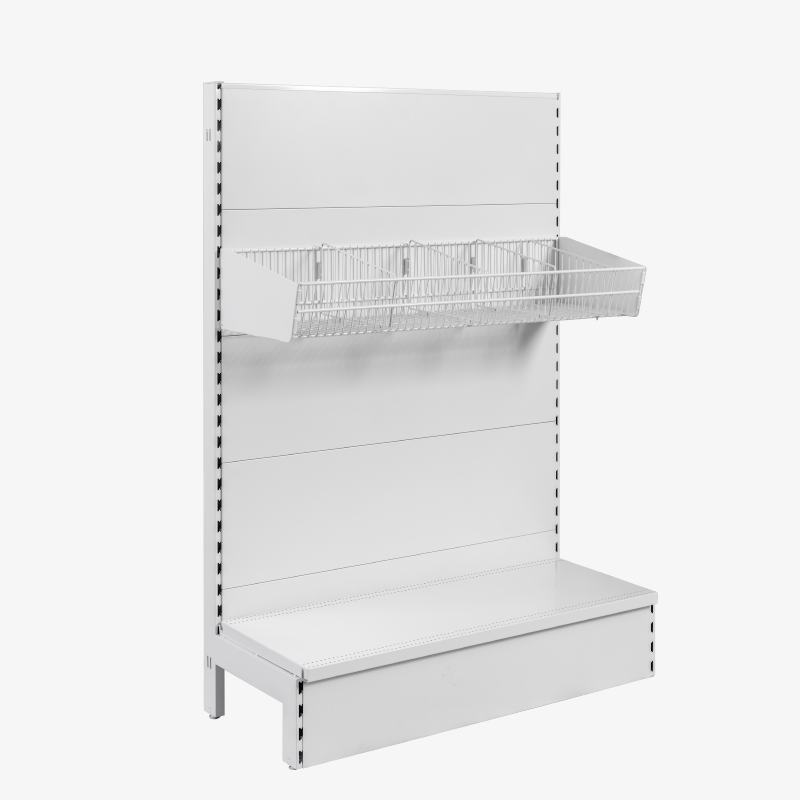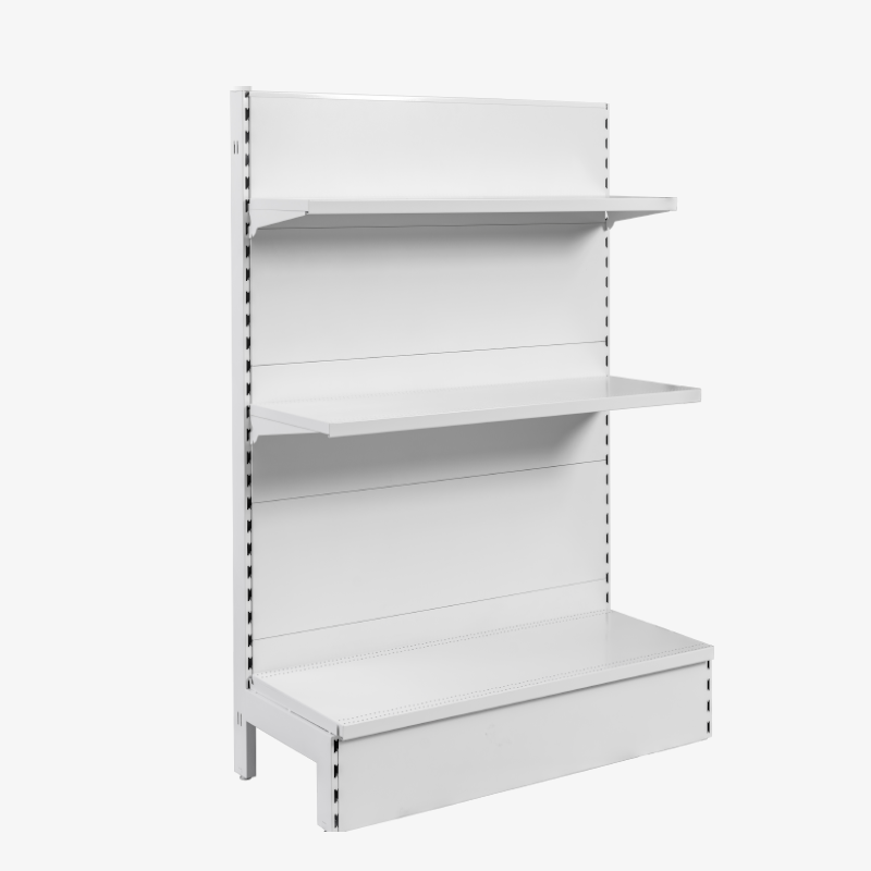 White Metal plain panel Single-sided Gondola Shelving starter bay with a front kicker included.