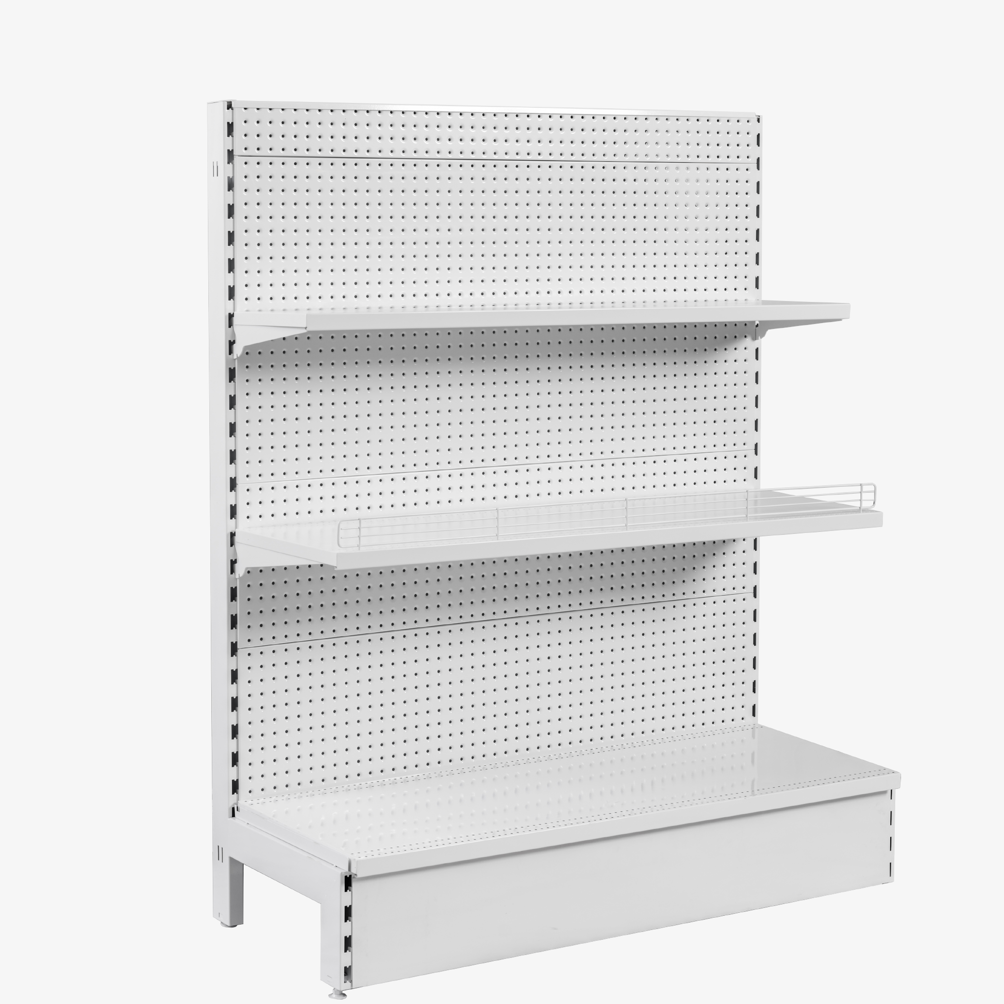 White Metal volcano board Single-sided Gondola Shelving starter bay with a front kicker included.