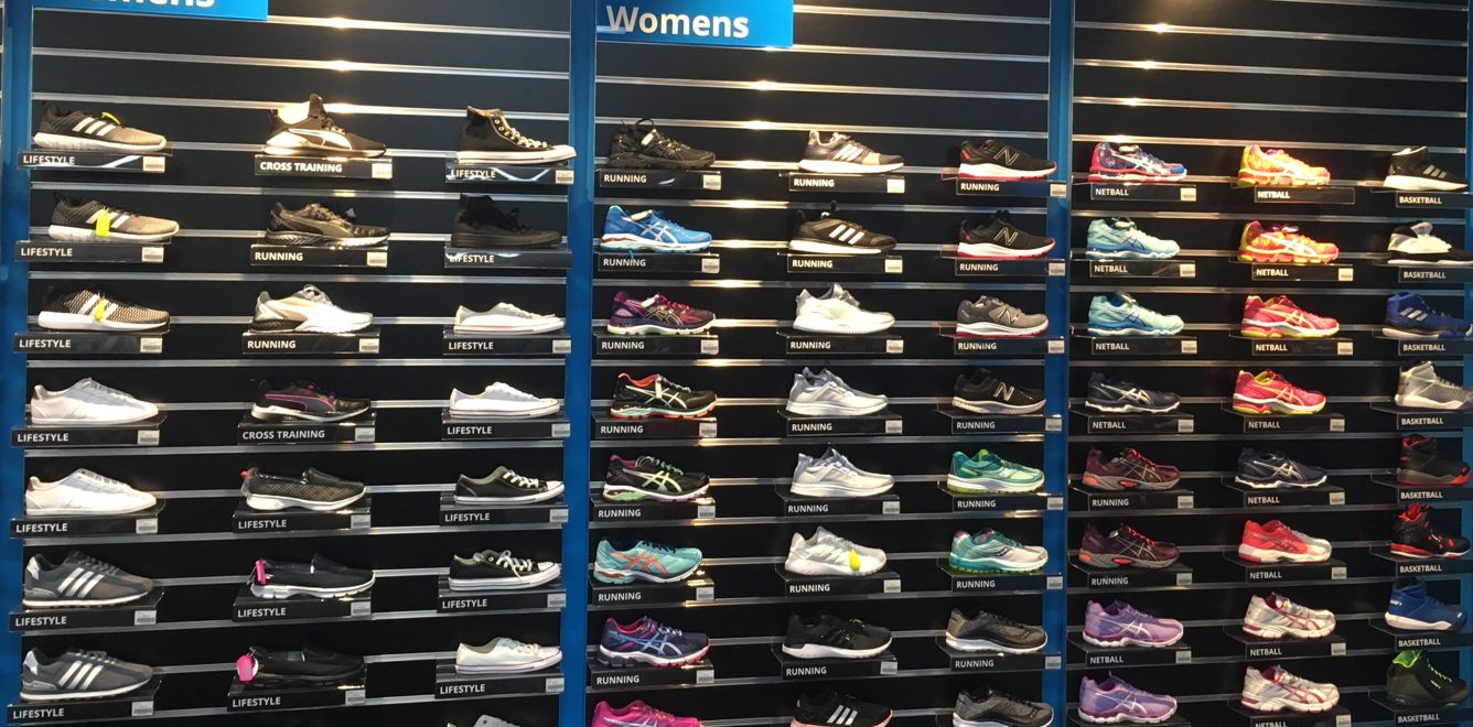 merchandising display products are sneakers, heels, or boots, supermarket, convenience store our shelves