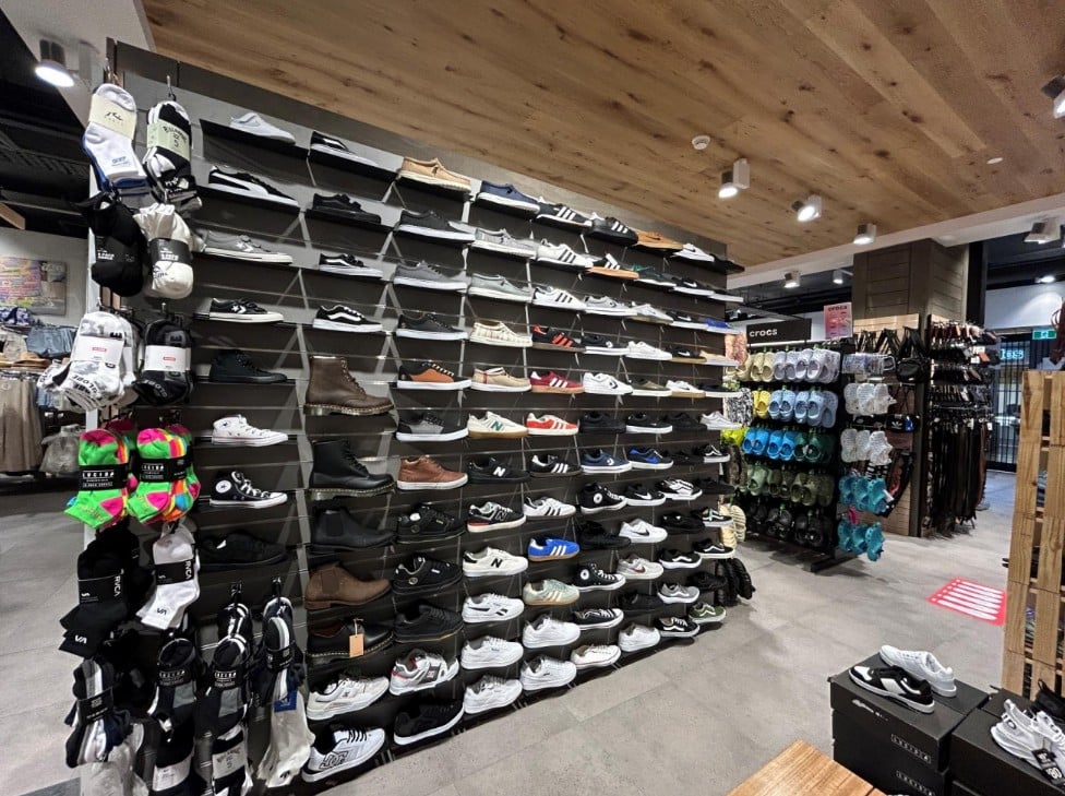 merchandising display products are sneakers, heels, or boots, supermarket, convenience store our shelves